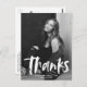 Une carte postale moderne vous remercie avec la photo du diplômé avec "merci" dans une superposition de script en brosse blanche. Personnalisez le devant de la remise de diplômes merci carte postale en ajoutant le nom, l'école, le nom et l'année de remise de diplômes. Le verso de la carte postale affiche votre adresse de retour avec votre message de remerciement dactylographié ou manuscrit.
