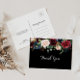 Cette carte postale de mariage botanique noir rustique vous remercie est parfaite pour un mariage classique. Le design est composé de fleurs bordeaux, rouges, navy, bleues et rousses rayonnantes et gracieuses peintes à la main dans un arrière - plan noir, inspirant beauté naturelle. Customisez le dos de la carte postale, y compris vos noms, votre adresse de retour et un message de remerciement. Ou, laissez la section de modèle de message de remerciement vide pour rédiger quelques mots sur chaque carte après leur arrivée. Ces cartes peuvent être utilisées pour un mariage, une douche nuptiale, ou chaque fois que vous voulez dire merci.