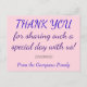 Ce design simple, simple et personnalisé de carte postale de remerciement mariage comprend le message "MERCI pour partager une journée si spéciale avec nous !" sur le devant, ainsi qu'un message personnalisable sur le dos. Il présente des couleurs comme le rose et le violet. Il pourrait être utilisé pour offrir de la gratitude à quelqu'un qui a été invité à une cérémonie de mariage.