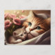 Deux âmes douces et câlées, unies dans un moment de paix. Une chatte-mère et son petit chaton, enveloppés dans une feuille molle, se serrent les coudes, donnant une chaleur réconfortante. Les fleurs roses qui les entourent apportent une touche délicate à cette charmante scène. Que ces adorables chatons apportent joie et tendresse à la vie de ceux qui reçoivent cette carte postale.