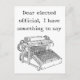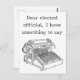 En ces temps troublés et perturbants, il est important d'agir pour protéger vos intérêts et promouvoir votre vision du fonctionnement du gouvernement. Entre les cycles électoraux, pendant que vous attendez de voter, il y a quelque chose que vous pouvez faire. Vous pouvez écrire à vos législateurs et autres élus pour exprimer vos préoccupations et leur dire ce que vous voulez qu'ils fassent. Qu'il s'agisse d'une protestation, d'un vote de soutien ou d'une suggestion. Une carte postale ne peut pas sembler être une force considérable, mais multipliez cela par des centaines, des milliers et des millions de citoyens partageant les mêmes idées et vous serez, en effet, une force de la nature. Utilisez cette carte comme un élément qui attire l'attention lorsqu'elle atterrit dans le courrier de votre élu. Il est préférable d'écrire votre message de votre propre main au dos, avec l'adresse de destination appropriée. Vous pouvez également modifier le texte au recto pour faire passer le message un peu diff
