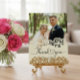 This picture is a wedding thank you card featuring a photograph of a couple, with decorative elements and text.