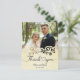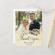 This picture is a wedding thank you card featuring a photograph of a couple, with decorative elements and text.