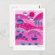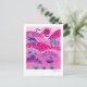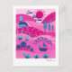 This notecard features a vibrant, stylized landscape with a whimsical and modern aesthetic. It uses a rich color palette of deep blues, vibrant pinks, and purples to create a layered, multi-dimensional scene with imaginative details, including flying fish, birds, a small sailboat, and a stylized house nestled in the hills under a pink sun. Contrast colors that give it a playful, yet sophisticated feel.