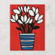 Les pétales de cérulean s'associent magnifiquement avec un vase rayé rouge contre une base en ivoire propre, rappelant le design scandinave des années 60.
