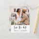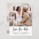 Photo moderne et élégante Enregistrer la Carte Mariage Date. La carte d'invitation à la date comprend la typographie blanche et le design chic et simple sur un arrière - plan blanc que vous pouvez ajouter votre photo fiançailles customisée à.