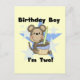 T-shirts, costumes, cartes, autocollants, magnets, sacs, et plus encore avec un mignon singe garçon avec un cupcake bleu gelé et le texte qui dit "Birthday Boy I'm Two!".