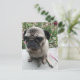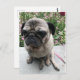 Mops im Garten vor der Blumenwiese. Schöne Postkarte für Hundeliebhaber.