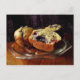 Cette carte postale présente des muffins bleuets alléchants disposés sur une plaque en verre brillant sur une table en bois. L'arrière - plan est drapé dans un tissu violet profond.