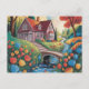 Une scène d'art naïf vibrante avec une grande maison nichée dans des collines ondoyantes, des fleurs bleues, oranges et jaunes éclatantes fleurissant dans l'arrière - plan, de grands arbres entourant un pont en pierre gracieux au-dessus d'un ruisseau qui coule doucement, le tout sous un ciel tourbillonnant de style mosaïque plein de mouvement et de couleur.