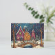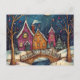 Une scène fantasque de Noël d'art naïf, avec un charmant pont voûté traversant un ruisseau qui coule doucement. La neige recouvre le paysage, avec des cottages douillets qui regardent à travers les arbres de l'arrière - plan. Au bord de l'eau et près du pont, de grands arbres de Noël se dressent fièrement, ornés de billes colorées et de lumières scintillantes. La scène brille d'un esprit de vacances chaleureux et joyeux.