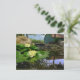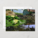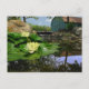 Des nénuphars dans un étang dominent le premier plan de cette image, avec une petite cascade et bâtiment dans l'arrière - plan.