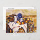 Une carte postale représentant l'aquarelle d'art fin, Nature morte au pot bleu, par l'artiste post-impressionniste français Paul Cézanne (1839-1906), vers 1900. Cette nature morte représente une théière bleu foncé sur une nappe à motifs, accompagnée de fruits.