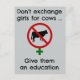 N'échangez pas des filles contre des vaches, donnez-leur de l'éducation. Notre conception a été inspirée d'affiches du gouvernement du Kenya et de Tanzanie portant ce message. Dans certaines parties de l'Afrique rurale, le bétail est échangé contre une jeune mariée. Cela met généralement fin à l’éducation des filles. Les opposants à cette tradition pensent qu'une fille instruite va élever le niveau de vie de sa famille et de sa communauté. Ce design convient aux arrière - plans blancs et clairs.