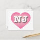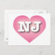 Cette carte postale est composée d'un coeur rose, calme et cool, et d'un centre blanchi à la chaux, contenant les lettres coques supérieures en gras et blanches NJ, l'abréviation officielle du New Jersey, état du jardin. Le verso de la carte postale est vide, en attendant votre texte customisé et/ou vos sentiments manuscrits.