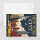 Cette carte postale présente une illustration de style vintage captivante de New York la nuit. Il affiche en évidence la Statue de la Liberté et l'Empire State Building, à côté d'un taxi classique jaune. Le paysage urbain est illuminé sous un ciel sombre et étoilé avec un croissant de lune, et "NEW YORK CITY" est écrit verticalement à droite.