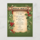 Une invitation sur une carte postale, vos amis adoreront. Sur un vieux défilement, "Écoute-moi ! Entendez Ye!" texte avec toutes les informations nécessaires pour une invitation à un dîner potluck. Un arrière - plan de Noël rouge vif complète l'invitation. Egalement disponible avec un arrière - plan rouge
