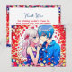 Notes de remerciement personnalisées pour votre mariage animé. Des fleurs rouges, bleues et blanches et un mignon couple de dessins animés qui se câlinent.