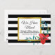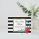 Vous pouvez personnaliser le texte noir avec votre nom et votre nouvelle adresse. Le champ de texte personnalisé indique "Nous avons déménagé" au-dessus du nom et de l'adresse. L'arrière - plan a des rayures horizontales en noir et blanc. Une fleur rouge se trouve dans le coin inférieur.