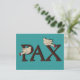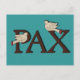 Deux colombes reposent parmi les lettres du mot "PAX" dans le dessin médiéval de cette carte postale. Les deux oiseaux de paix classiques aux couleurs lin sont remplis d'un motif floral tourbillonnant. Les bandes toniques de framboise sur leurs ventilateurs de queue ajoutent une touche de couleur et la même couleur rose-rouge sur leurs becs. Le mot latin pour "paix" est dans un texte gothique et bordeaux profond. Une ombre de chute gris foncé donne la profondeur de conception pour un aspect en trois dimensions. À partir de mon numériquement original créé image.