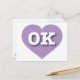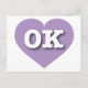 Cette carte postale est dotée d'un coeur de lavande moelleux contenant les lettres coques supérieures blanches et audacieuses OK, l'abréviation officielle pour Oklahoma, l'état le plus tôt. Le verso de la carte postale est vide, en attendant vos sentiments manuscrits ou le texte personnalisé. Choisissez le style, la taille et la couleur de la police.