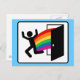 Inspiré par un panneau d'avertissement de sortie de secours, ce design amusant de fierté gay illustre une silhouette sortant d'un placard dans une explosion de couleurs arc-en-ciel.