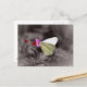 Une belle carte postale en noir et blanc avec une coloration sélective sur le papillon blanc jaunâtre embrassant un joli fleur sauvage rose.
