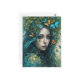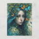 Une femme aux cheveux bleus flottants est entourée de papillons et de feuilles, créant une atmosphère mystique et éthérée. Son expression sereine et ses couleurs vives transmettent un sentiment d'harmonie avec la nature.