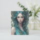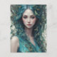 Une femme aux cheveux bleus flottants est entourée de papillons et de feuilles, créant une atmosphère mystique et éthérée. Son expression sereine et ses couleurs vives transmettent un sentiment d'harmonie avec la nature.