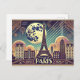 Voici une carte postale de voyage vintage rehaussée avec Paris et la Tour Eiffel dans un style Art Déco chic, désormais dressée contre une nuit romantique au clair de lune. 🇫 🗼 🌙 L'arrière - plan présente des teintes pastel douces de bleu profond, violet et or, avec des lumières de la ville. L'audacieuse typographie d'inspiration Art déco dit "Paris romantique", et le design comprend désormais des bordures élégantes, des accents dorés glamour et des motifs tourbillonnants