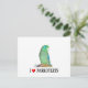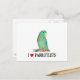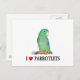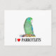 Un parrotlet spectaculaire est montré avec le texte "I heart parrotlets" sur cette carte postale mignonne