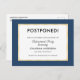 Vous avez besoin de reporter votre événement ? Envoyez cette carte postale pour informer vos invités du changement de plan. Le design simple est accentué par une bordure bleu foncé et or.