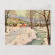 Belle illustration vintage d'une route ensoleillée et enneigée bordée d'arbres, ruisseau courant à côté et maison et grange au loin. Parfait pour un billet ou même une carte de Noël.