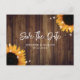 Mariage de tournesol personnalisé sauvez les cartes postales datées avec des tournesols sur un arrière - plan en bois de grange orné de lumières scintillantes. Ces mariages fleuris à l'exception des cartes postales datées sont parfaites pour un pays rustique, ou la grange été, ou fête mariage de automne.