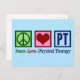 Cette jolie carte postale de physiothérapeute comporte un signe de paix, un coeur et les lettres PT pour la thérapie physique. Cartes de vacances ou de Noël pour un bureau de physiothérapie ou d'affaires.
