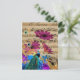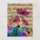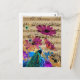 Un beau paon turquoise et bleu trône sur des fleurs violettes et bleues, agrémenté d'un arrière - plan tanné.