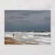 Un homme se tient au bord des vagues en train de pêcher par un matin orageux.
