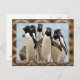 Six Penguins Marcher le long de l'océan sur la plage de sable. Avec un gros rocher et le beau ciel bleu bébé. Cette carte postale a un cadre marron abstrait.
