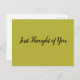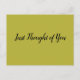 Carte postale classique, mais simple pour les moments où vous avez une pensée fugace spécifique sur quelqu'un et que vous voulez "rapidement" les faire savoir. Un appel téléphonique sera certainement faire, mais cette conservation spéciale dure aussi longtemps que le destinataire le désire. Rejoignez et surprenez quelqu'un avec votre attention! Il y a beaucoup de couleurs et une variété de messages à choisir.