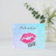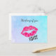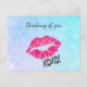 Une carte postale avec une paire de lèvres sexy en rouge à lèvres rose chaud avec xoxo! écrite à côté d'eux, créant une impression de rouge à lèvres. Le texte dit penser à vous. Placé sur un arrière - plan bleu turquoise.