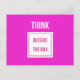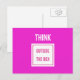 Un slogan amusant et intelligent sur une carte postale. 'Pensez' en blanc, à l'extérieur de la boîte, dans laquelle sont les mots 'hors de la boîte' en rose profond. Inspirez-vous, ou motivez un ami; soyez créatif et innovateur tout en vivant votre meilleure vie.
