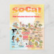 Vue colorée du sud de la Californie - des personnages loufoques folâtrent sur la plage et dans le désert de SoCal mettant en valeur Los Angeles, le comté d'Orange, Santa Barbara, San Diego, Riverside, Palm Springs, les parcs d'Anza Borrego et de Joshua Tree - ainsi que les villes frontalières de Tijuana, Tecate et Mexicali. Cette carte de SoCal a tout - un surfeur accroché à sa planche, une orque qui jaillit de l'eau, des animaux de zoo qui saluent les touristes, un couple de plage qui joue dans les vagues tandis qu'un T-Rex rugit un défi et un char qui gronde en position et bien plus encore…