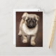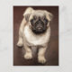 Photo d'un adorable chiot en carlin debout sur un parquet en bois foncé regardant directement la caméra.