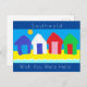 Illustration numérique de Beach Huts en bord de mer. Des cabanes de plage aux couleurs vives en bleu, blanc, rouge, vert sur une plage de sable jaune avec les vagues qui tapissent la scène. Un ciel bleu vif au soleil jaune. Personnalisez facilement cette carte en modifiant le texte modèle. Texte actuellement lu Southwold mais pourrait être facilement changé. Merci d'avoir vu mes dessins.