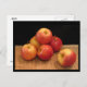 Cette carte postale présente une composition très simple de six belles pommes rouges et jaunes brillantes sur un tapis de paille contre un arrière - plan noir.