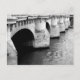 Photographie en noir et blanc de la Seine à Paris qui coule sous les piliers de pierre d'un pont.