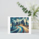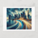 Un paysage urbain animé présente des gratte-ciel imposants et un ciel tourbillonnant rempli de motifs dynamiques. Le pont illuminé et les lumières fluides des véhicules créent une atmosphère énergique.