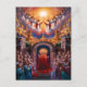 Entouré d'une foule de spectateurs, un personnage au lit, Jésus, est debout avec des bras tendus sous une arcade qui symbolise l'entrée du ciel. Ci-dessus, une cascade d'anges ornés de vêtements flottants descend des nuages, avec quelques croix, créant un escalier vers le royaume divin. Les couleurs vives et la scène céleste dramatisée évoquent un sentiment d'émerveillement religieux et le voyage métaphysique de l'ascension.