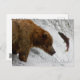 Cette carte postale saisit un moment incroyable à Brooks Falls dans le parc national Katmai, en Alaska. Un puissant ours brun se dresse au sommet des chutes, parfaitement chronométré pour attraper un saumon qui saute en haut. L'image montre le saumon juste à côté de la bouche de l'ours, illustrant la précision et l'habileté de ces magnifiques chasseurs. C'est une scène vraiment dynamique et iconique de la nature sauvage de l'Alaska.