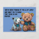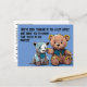 Cette carte postale est l'illustration attachante d'un charmant ours en peluche et d'un agneau doux représenté par des lignes pointues. L'ours en peluche, avec sa fourrure molle et son sourire amical, est assis à côté de l'agneau, ce qui dégage un calme serein. L'oeuvre capte un sentiment d'innocence et de chaleur, ce qui en fait un spectacle enchanteur à contempler. Le dos de la carte postale peut être personnalisé avec le nom du destinataire, un message et votre nom.